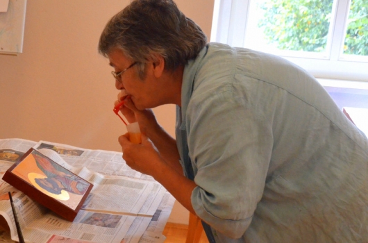 Tudi letos je bilo tako. Skupina šestih tečajnikov, že izkušenih in teh, ki se radi vračajo, so ustvarjali svete podobe na najčistejši način. Mirne in vztrajne poteze s čopičem so pod budnim očesom mentoric narisale čudovite mavrice barv, v katerih je skrita natančnost, doslednost in predanost.