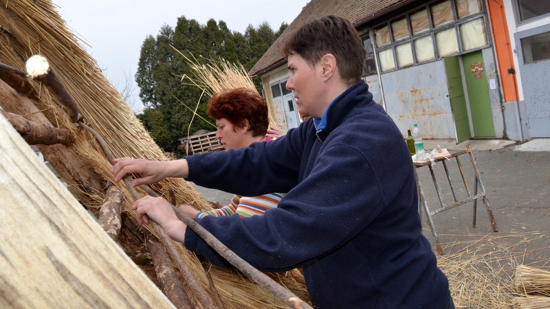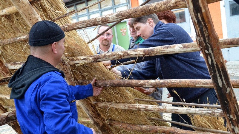 Kratkemu pouku in predstavitvi je takoj sledilo konkretno delo pod vodstvom mojstra Antona Golnarja iz Sovjaka. Ducat udeležencev iz vse Slovenije je prvi dan postavilo lično ostrešje in ga olatalo, naslednji dan pa se je pravzaprav delo šele začelo. Rženo slamo je bilo potrebno razvrstiti iz snopov v šope, ki so jih udeleženci menjaje vdevali med late. A vsa stvar le ni tako preprosta, kot se vidi na prvi pogled: za kvadratni meter slamnate strehe so z vsemi pripravami potrebne tri ure.
